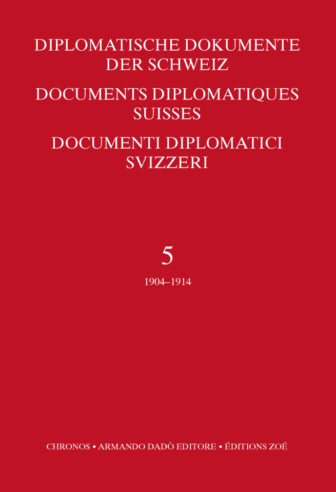 Aktenedition DDS, Bd. 5 (1904–1914) ISBN 3-7165-0458-0 Diplomatische Dokumente der SchweizBand 5 (1904–1914)bearbeitet von Prof. H. Lüthy, Prof. G. Kreis, Universität Baselgebunden, mit Schutzumschlag, 16x24cm,1983. XCII und 952 Seiten.CHF 150.– pdf Dokumente in Dodis Dokumente in Dodis ISBN 3-7165-0458-0